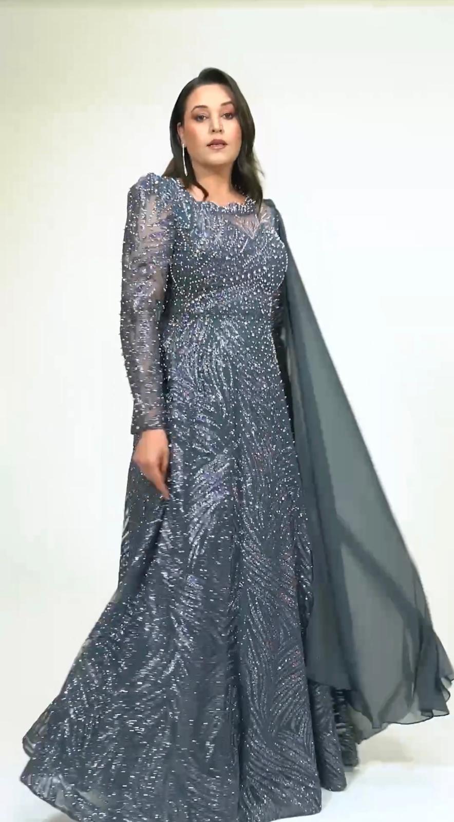 This stunning floor-length gown features an elegant illusion neckline with sheer mesh detailing across the chest and shoulders. The fitted long sleeves are crafted from transparent fabric adorned with intricate sequin embellishments throughout. The bodice showcases a flattering wrapped design that transitions into a flowing A-line silhouette. The entire garment is covered in elaborate sequined patterns that create beautiful geometric and swirl motifs across the fabric. The gown includes dramatic cape-like extensions from the sleeves, adding an extra touch of glamour and movement. Perfect for formal occasions, this luxurious piece combines modest coverage with show-stopping sparkle and sophisticated design elements.