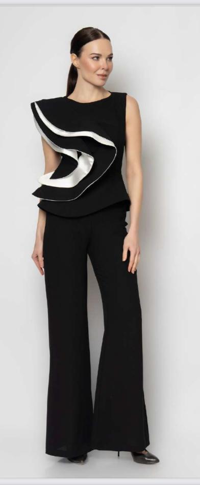 Make a bold architectural statement with The Noir Wave Set, a sculptural two-piece ensemble that merges modern art with high fashion. The sleeveless top features an abstract layered wave design in contrasting monochrome, adding dimension and movement. Paired with wide-leg tailored trousers, this look delivers power, poise, and a punch of personality perfect for formal events, fashion-forward dinners, or commanding attention at any upscale gathering.